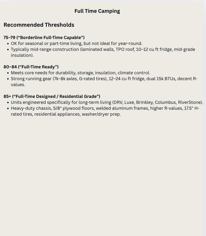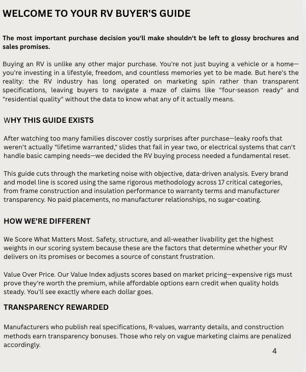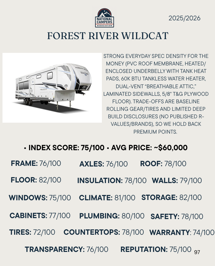 The RV Buyer’s Guide cuts through marketing and delivers clear, comparable scores for the rigs on your shortlist. Each model is evaluated across the things that actually matter on the road: frame and roof, floors, plumbing, electrical, windows, axles and suspension, tires, cabinetry, countertops, safety features, warranty strength, and manufacturer transparency. We publish an overall Value Index with a quality floor of 70, so anything below that is flagged as a do-not-buy.